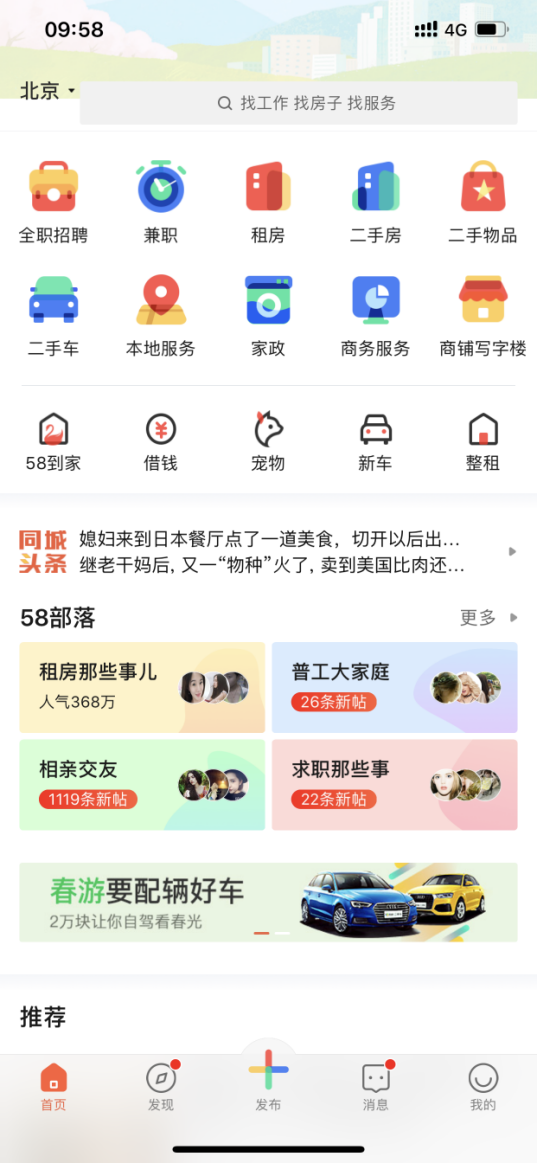 目前,用户通过58同城APP首屏即可进入58部落,在这里,找同行、房产、汽车、找老乡、交朋友等模块一应俱全,用户可以在这里分享自己的工作、生活、技能、抒发感情、结交同好。同时,还可以了解到各行各业从业者的真实生活状态,收获知识、技能和社会经验,“秀”出真实的自己,也能成为其他用户生活困扰和难题的解决导师,让每个声音更有力量。