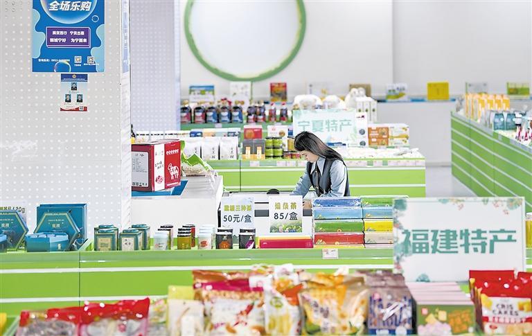 12月9日,工作人员在狮城宁好电商网批(西部)运营基地展销区整理货物。基地位于宁夏吴忠市盐池县,是福建石狮与宁夏盐池跨地域商业合作示范基地,为当地打造电商模式新业态。冯开华摄(新华社发)
