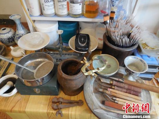 记者8月21日走进王春发的工作室,他正在桌前修复脱色瓷器,手旁化学试剂瓶、颜料瓶成排分布,瓷器碎片分类堆叠。作为济南市级非遗项目古陶瓷修复技艺代表性传承人,王春发已从事古陶瓷修复20余年。