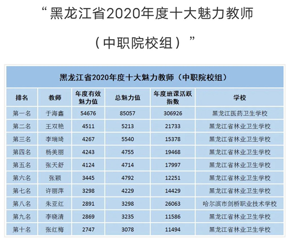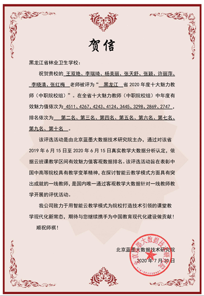 为表彰中国大学及职业教育领域具有教学变革精神,并在智能云教学和探索新教学模式方面具有突出成就的一线教师,近日,由北京蓝墨大数据技术研究院主办的“2020年度十大魅力教师”省级评选结果正式出炉。作为黑龙江职业院校的代表单位,省林业卫生学校八名教师荣获殊荣“黑龙江省2020年度十大魅力教师”称号。