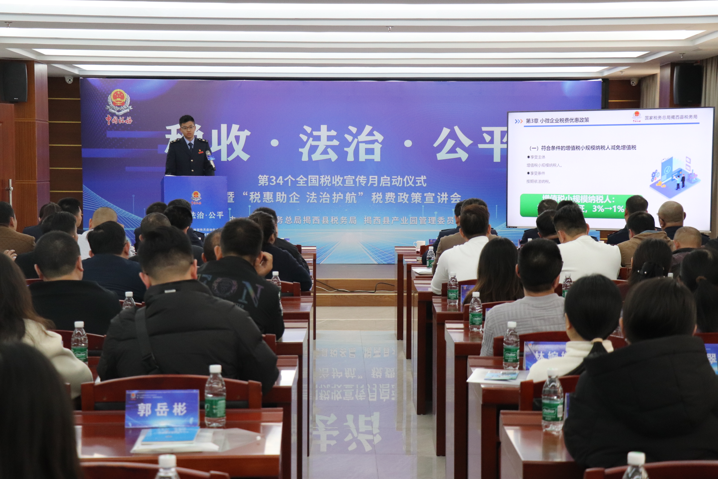 为进一步推动政策红利精准、高效直达各类经营主体,4月1日,国家税务总局揭西县税务局在揭西县产业园举办第34个全国税收宣传月启动仪式暨“税惠助企 法治护航”税费政策宣讲会,围绕“税收法治公平”的税收宣传月主题,通过“政策解读+案例分析+现场答疑”的方式开展税费政策专项辅导。揭西县产业园管理委员会党组书记、主任林志勤出席活动并致辞,县内60多名企业代表参加了会议。