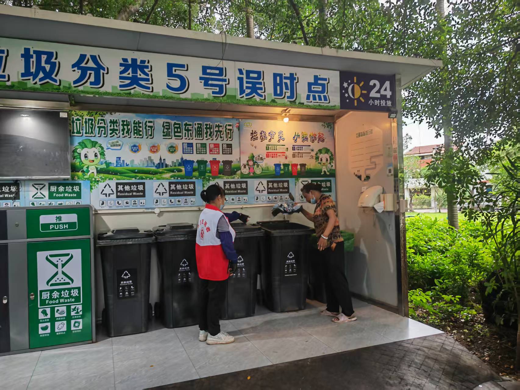 另外组织志愿者在各居住小区内开展投放点位巡查志愿服务,检查投放点位硬件施舍管养情况,遇到居民投放垃圾时,检查居民投放时是否进行分类,提醒他以后在家先分好再来投放。
