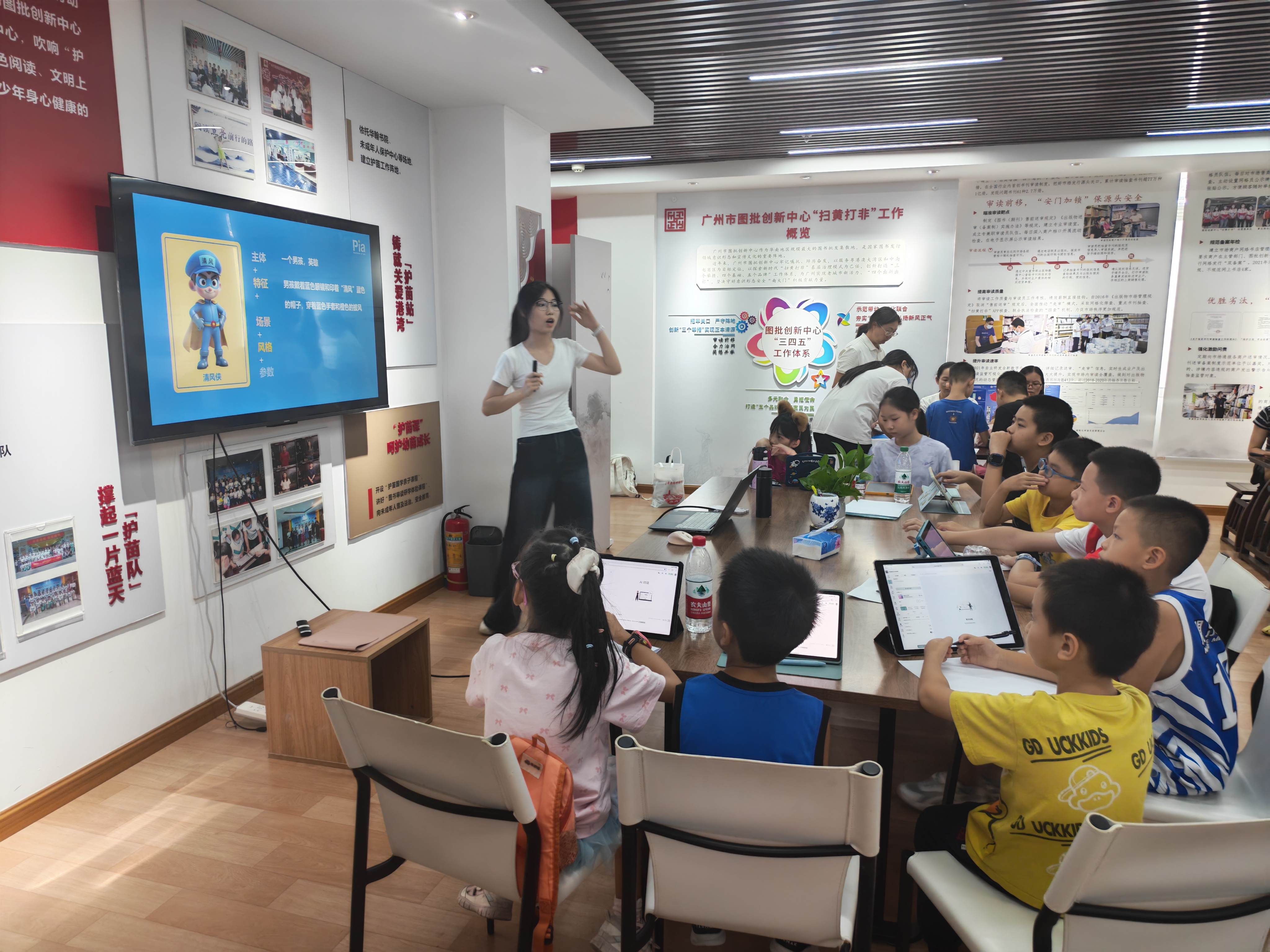 在广州市图批创新中心,学员们系统学习AIGC创作课程,解锁数字艺术创作新技能,发挥想象力,通过科技赋能将脑海中的“清风侠”呈现出来。“我心中的清风侠,像净化网络文化安全的卫士守护着我们。”来自黄埔区铁英小学的颜同学分享自己的创作思路。