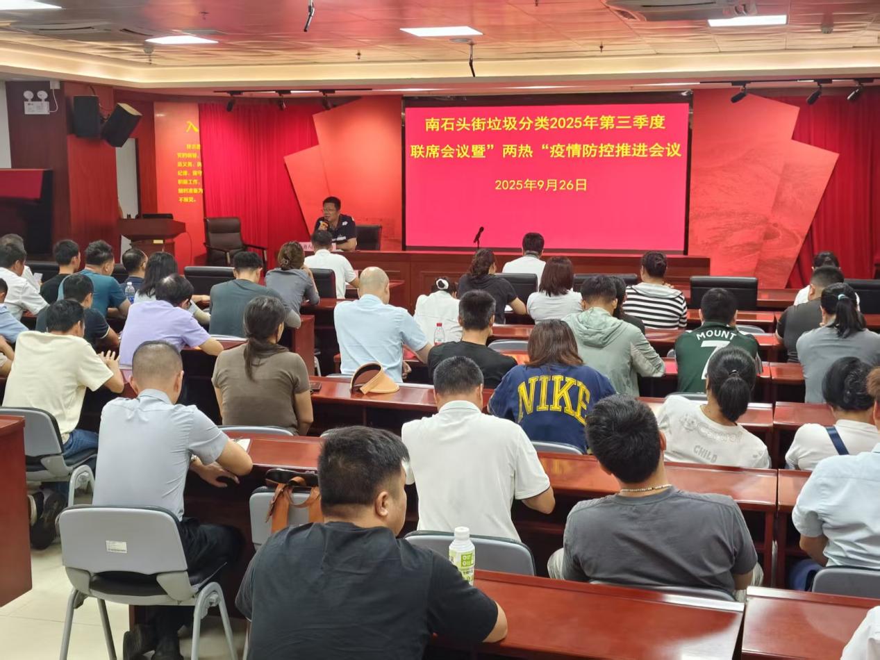 2025年9月26日上午,海珠区南石头街道召开2025年垃圾分类第三季度联席会议暨“两热”疫情防控推进会议,南石头街道相关领导班子、南石头街道环监所及各社区居委、机团单位、物业公司代表等共60余人参加本次会议。