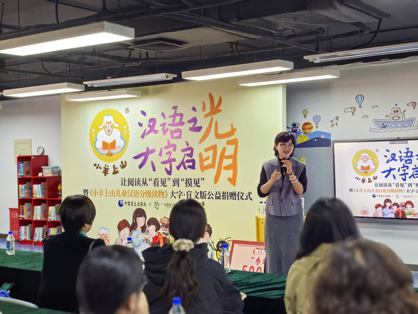 10月15日国际盲人节,《小羊上山儿童汉语分级读物》大字盲文版公益捐赠仪式在中国盲文图书馆举行。当《小羊上山》执行主编许立春第一次触摸到刚刚印制好的这套样书时,她说:"这就是我们一直在寻找的答案。"