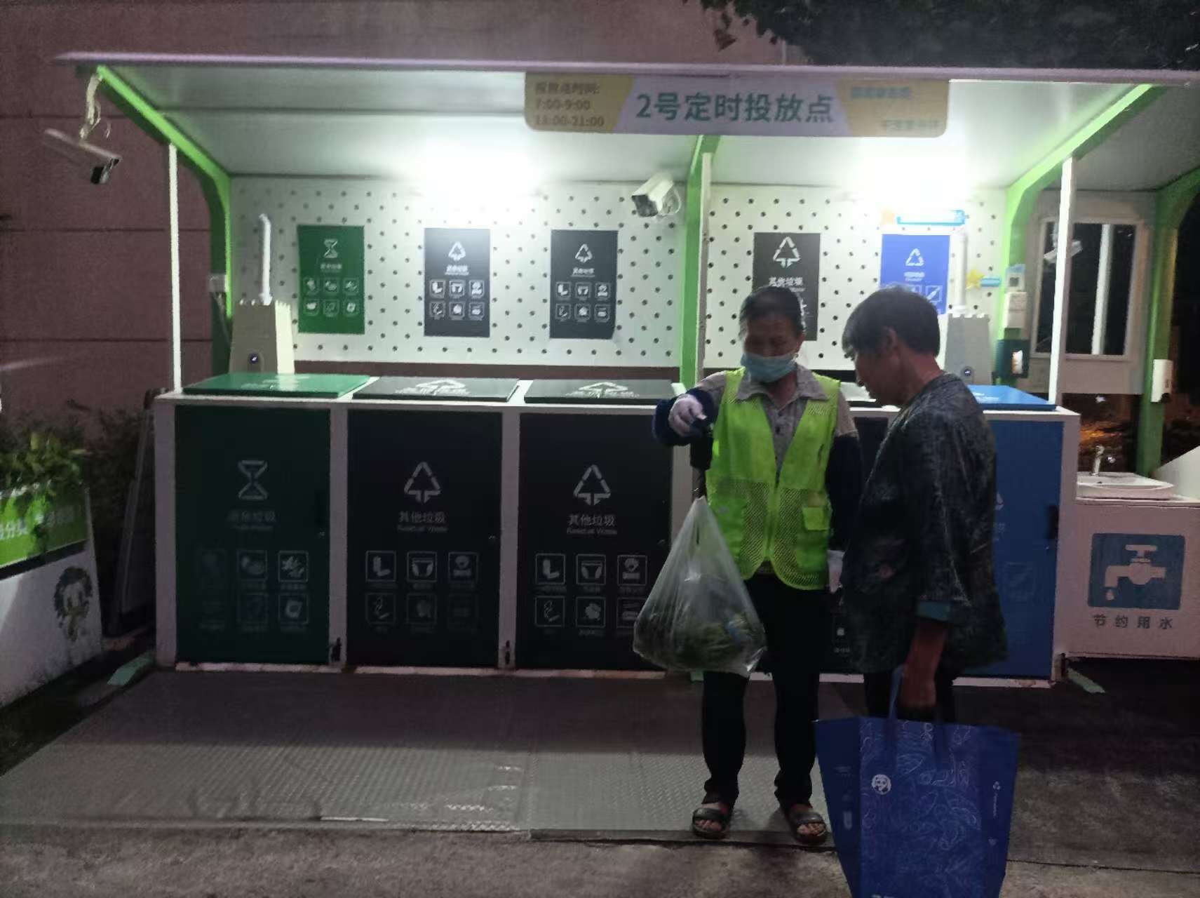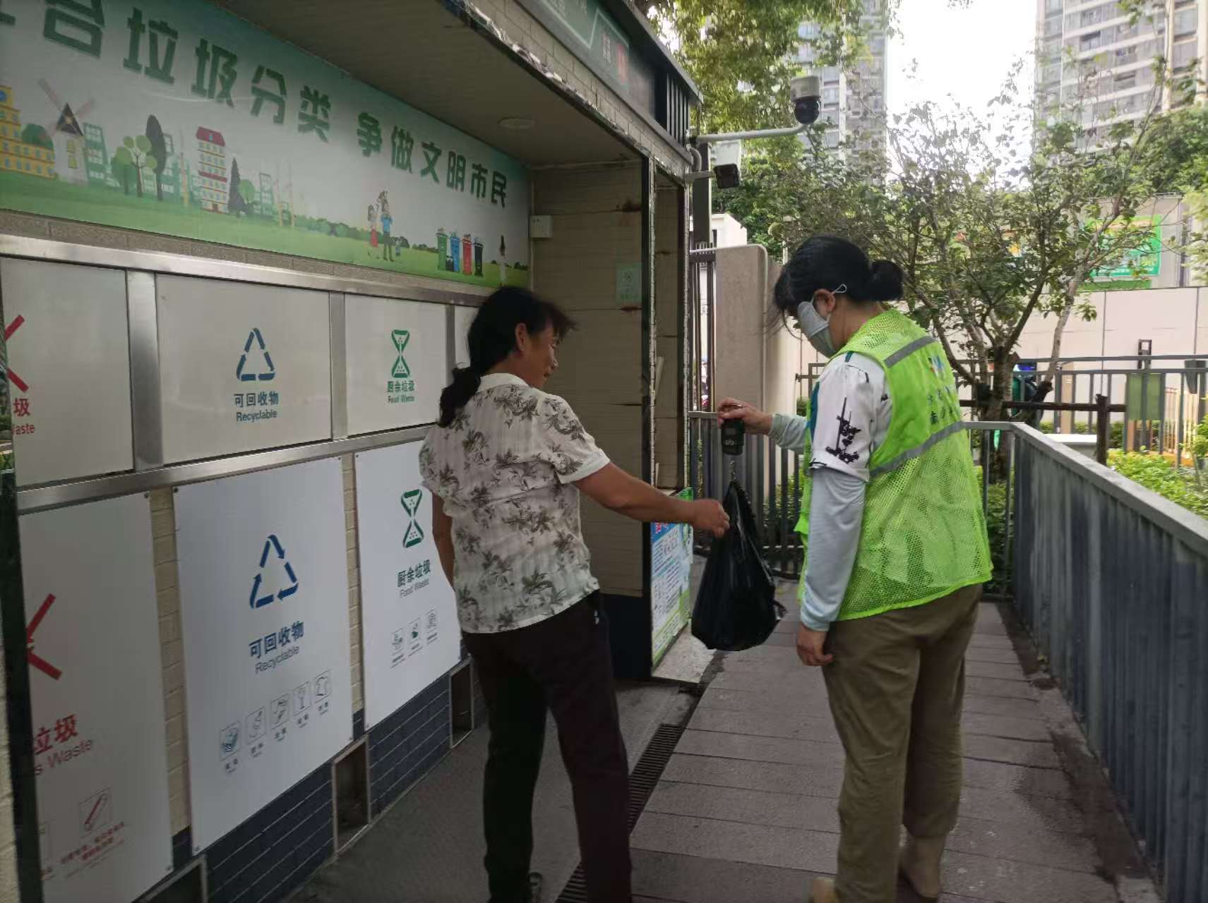 投放点开放时段,志愿者在垃圾分类投放点现场对分好类的厨余垃圾称重,并记录数据,对分类准确、纯净度高的家庭给予礼品奖励。针对混投、错投现象,志愿者当场纠正并讲解分类标准,确保“一袋一称、一袋一改”。