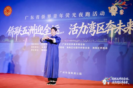 夜幕初垂,海珠湖畔荧光点点。活动在热烈的签到与荧光装备发放中拉开序幕,侨界青年们在主题背景板前合影留念,并在世界冠军、中国田径健将莫有雪的带领下进行热身,现场气氛迅速升温。