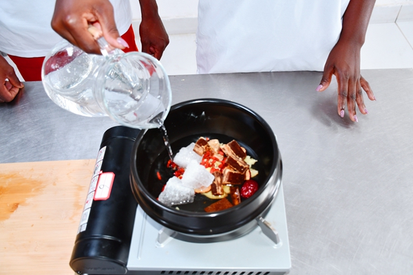安哥拉员工乔治饶有兴致地拿起生姜、红枣、红糖等材料,仔细端详,感慨道:“用生姜来制作茶饮,胃里暖暖的,真是既新奇又有趣。”