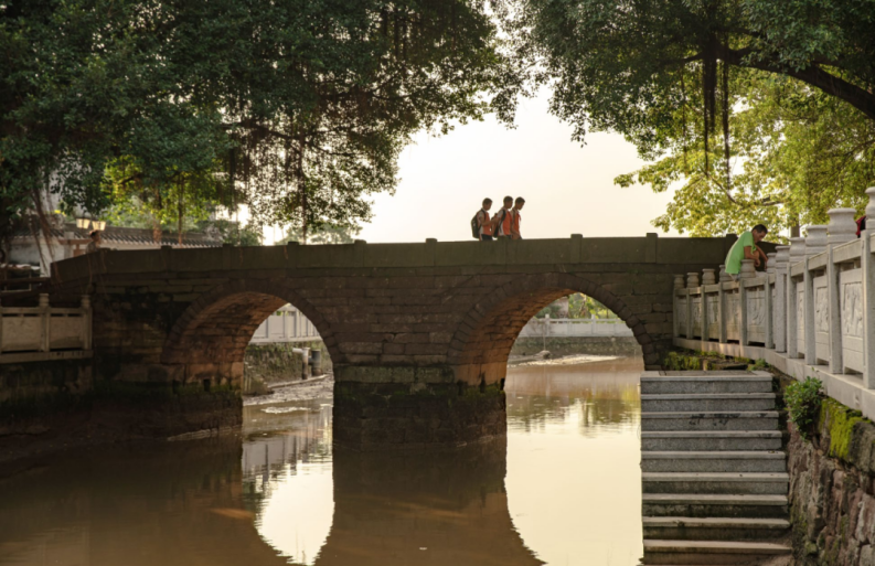 横跨玉带河的龙津桥,是“文房四宝”中的“笔架”。始建于清康熙年间的石拱桥,以红砂岩石砌筑,东西两侧设有引桥,栏板上的花卉纹样历经百年风雨仍清晰可辨。站在桥头远眺,桥洞与水中倒影构成完整圆形,恰似饱蘸墨汁的毛笔,古时村民与考生常在此祈福,期盼“一跃龙门”。