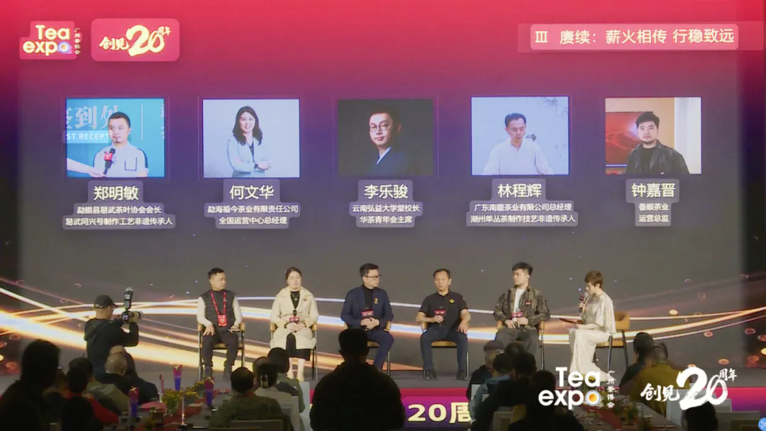 云南弘益大学堂校长、华茶青年会主席李乐骏,勐海福今茶业有限责任公司、全国运营中心总经理何文华,广东南馥茶业有限公司总经理、潮州单丛茶制作技艺非遗传承人林程辉,勐腊县易武茶叶协会会长、易武同兴号制作工艺非遗传承人郑明敏,番顺茶业运营总监钟嘉晋接受访谈。