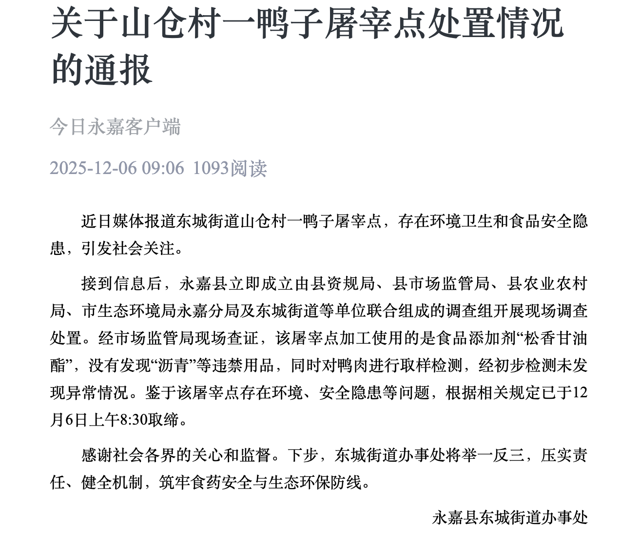 12月5日,潮新闻报道了温州市永嘉县东城街道山仓村一鸭子屠宰点存在环境卫生和食品安全隐患的问题,随即引发多方关注。