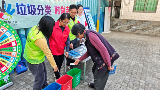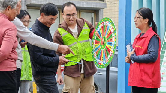 活动紧扣“寓教于乐”理念,巧妙融合游戏形式与垃圾分类知识。在“知识转盘”的环节中,标注有各种垃圾的名称,待指针转动停止,居民需准确说出指针所指垃圾的分类类别,志愿者在一旁边及时纠正,细致讲解分类要点。