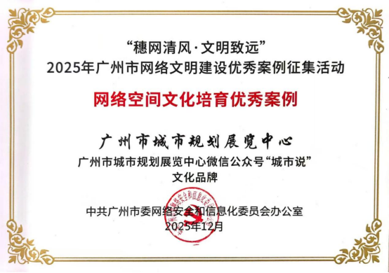 12月26日,广州市委网信办公布了“穗网清风·文明致远”2025年广州市网络文明建设优秀案例入选名单,广州市城市规划展览中心微信公众号“城市说”文化品牌获评为网络空间文化培育优秀案例。