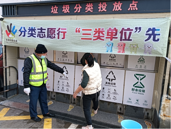 志愿者们每天在固定时段分别在社区生活垃圾分类投放点进行值守,对已经分类的居民进行开袋检查,做到准确分类,对没有分类的居民进行劝导,引导居民进行正确垃圾分类。