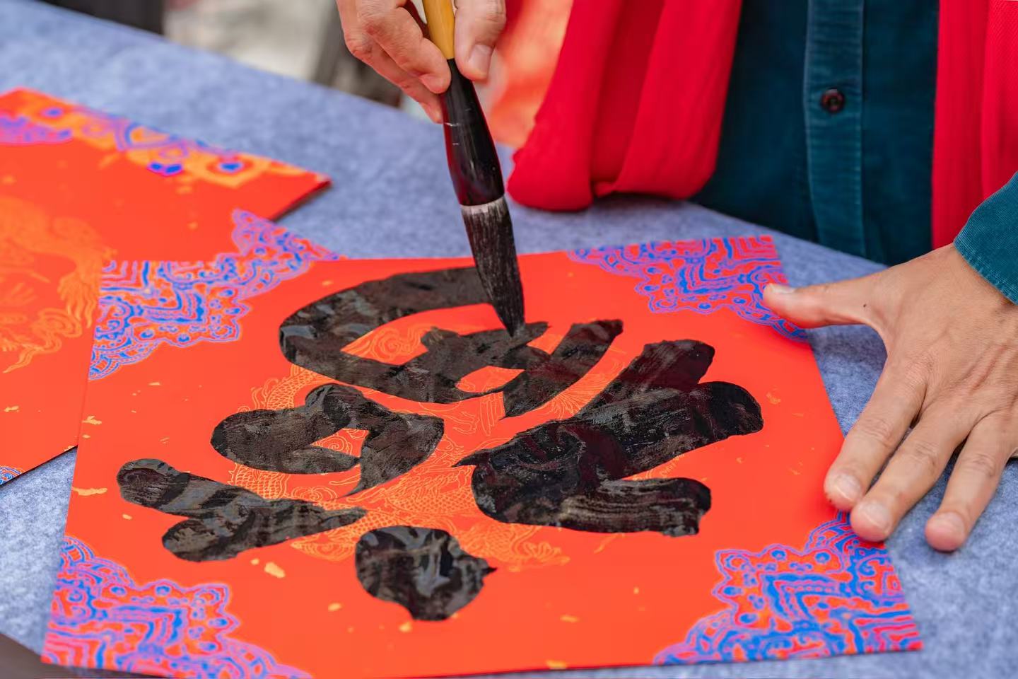 “我特意带孩子来感受年味,没想到还能拿到连登老师亲笔写的‘福’字!”家住天河区的李女士带着6岁的女儿排队后,终于获得一幅定制春联。她兴奋地表示,“孩子看到‘大湾鸡’人偶在书法家身边互动,特别开心!这种传统与潮流结合的方式,让年味更鲜活。”另一位年轻白领张先生则选择“前程似锦”作为春联内容:“今年刚创业,书法家还特意在落款处画了只小锦鲤,和‘大湾鸡’IP的吉祥寓意相映成趣,真是惊喜!”。