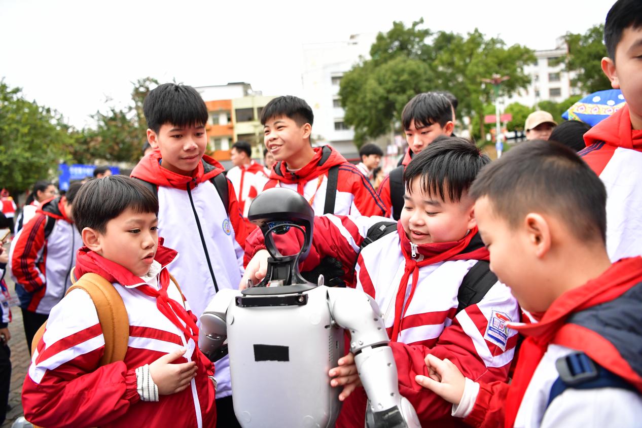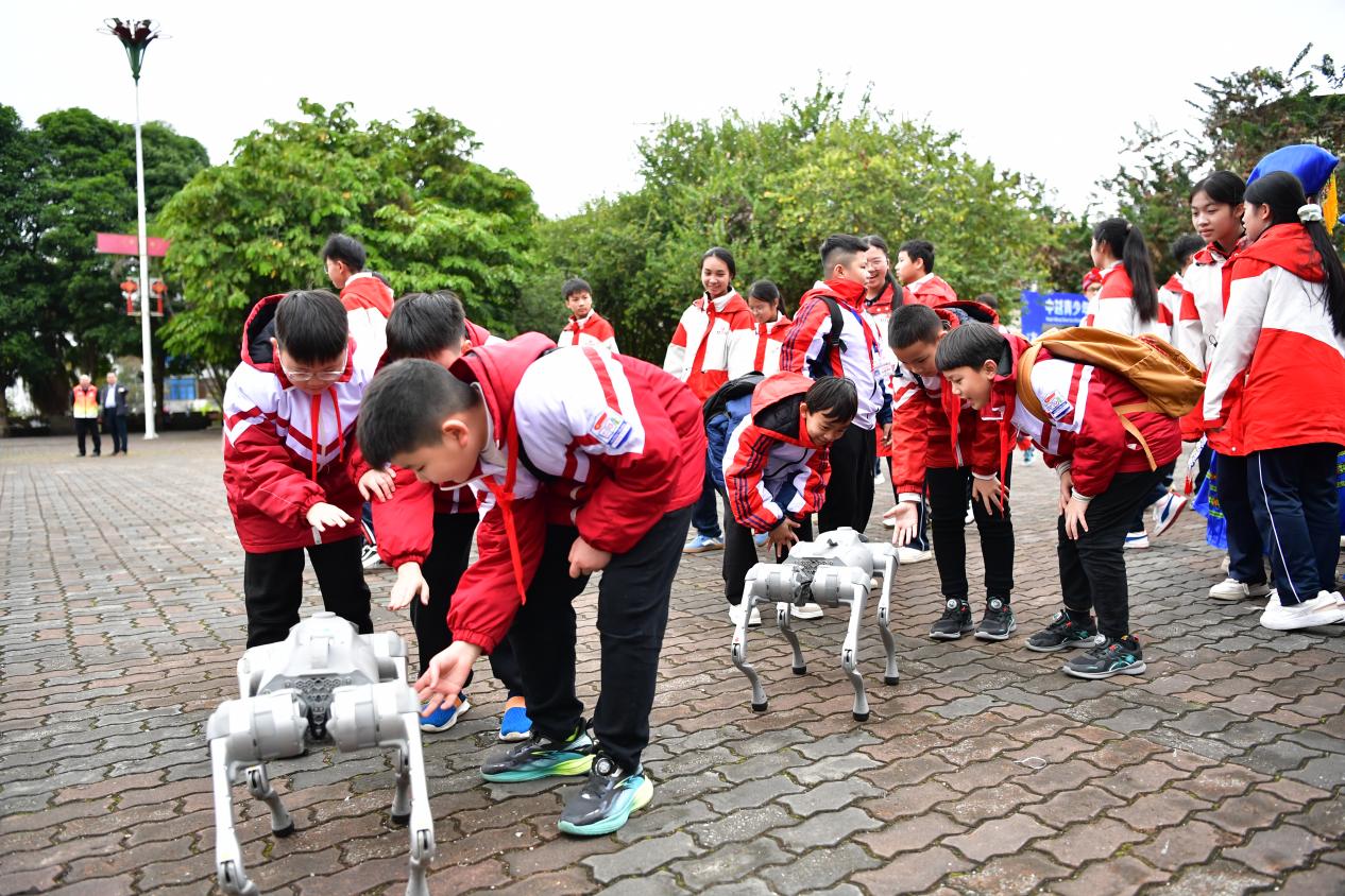 在凭祥市高级中学活动现场,广西科技馆科普大篷车带来的机器人对抗表演、机器狗障碍跨越演示、无人机救援演示等活动,吸引了众多师生驻足围观。在现场,两国青少年亲切交流,友好互动,共同体验富有壮族特色的背篓绣球项目;在科学实验器材、水火箭发射等多个展区,神奇的科学实验让大家惊呼不已;机器人、机器狗也随现场气氛舞动起来,引得大家笑声不断,纷纷与其握手合照……两国青少年学生在科技交流中彼此熟悉,紧密合作,增进友谊,现场热闹氛围在阵阵欢笑声中走向高潮。