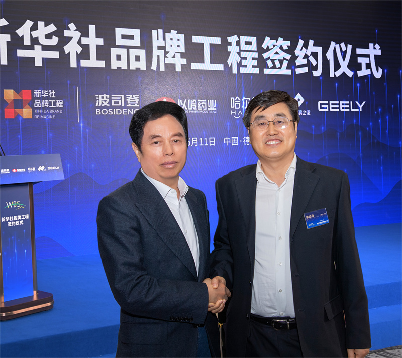 波司登入选新华社品牌工程高德康与新华社党组成员、秘书长景如月合影