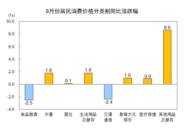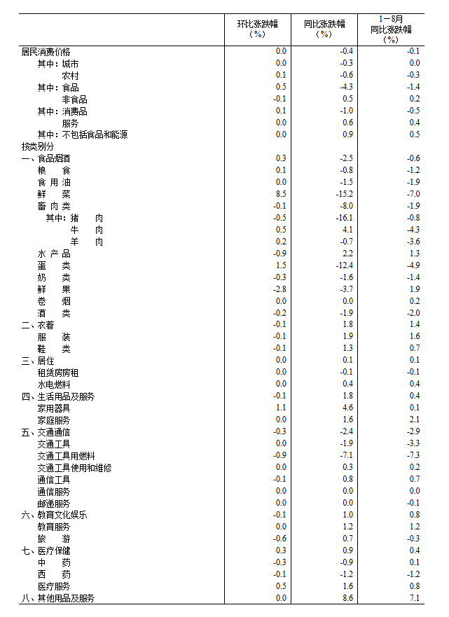 2025年8月份居民消费价格同比下降0.4% 环比持平