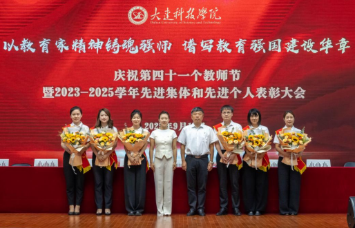 大连科技学院校长高小涵(左四)向该校2023-2025学年省级教育教学先进个人赠送节日鲜花并合影留念