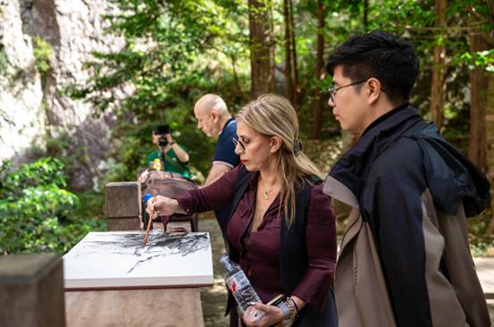 在楠溪江狮子岩,两国艺术家合作山水画,东方山水美学与西方艺术理念碰撞融合。“用中国绘画表现,有淡淡的水墨韵味,和水彩画笔比较,变化很微妙。”安东尼·迈克尔迪斯第一次尝试用毛笔,思考着如何将见到的壮阔天地,转化为中式笔下的意境流转。