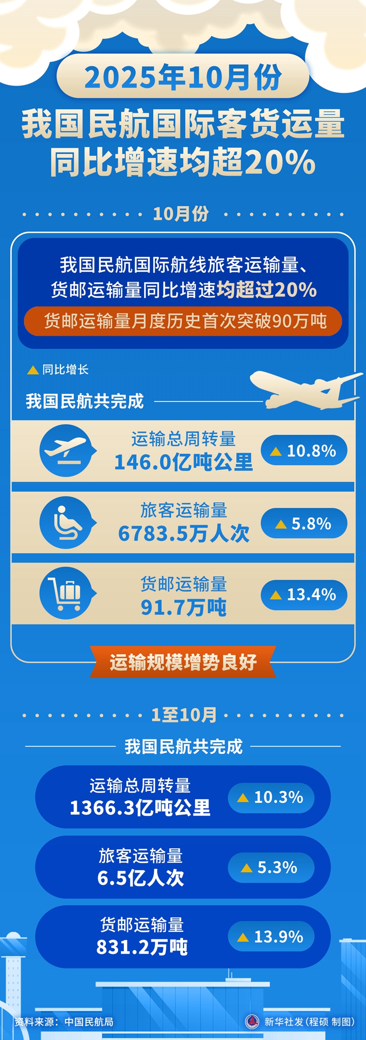 记者25日从中国民航局了解到,10月份,我国民航国际航线旅客运输量、货邮运输量同比增速均超过20%,货邮运输量月度历史首次突破90万吨。