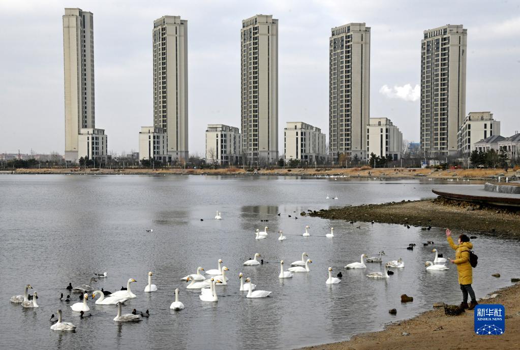 一位市民在荣成市崖头街道樱花湖畔给大天鹅喂食物(2月15日摄)。