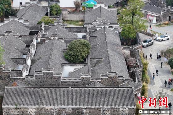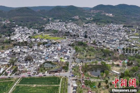 3月30日,江苏南京,航拍传统村落佘村。佘村有着600多年历史,村内屋舍错落有致,与山谷、湖泊、田园融为一体,自然生态良好,乡土气息浓郁。(无人机照片)