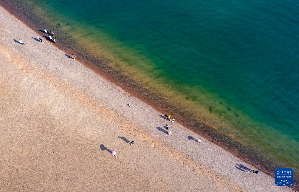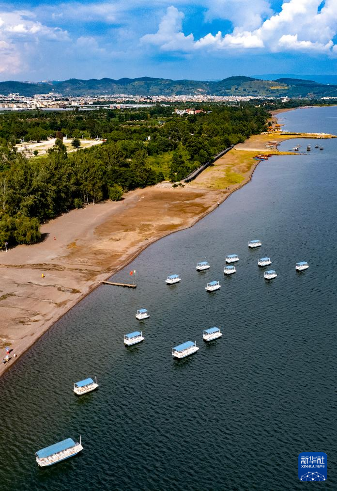 9月8日,游客在抚仙湖畔游玩(无人机照片)。