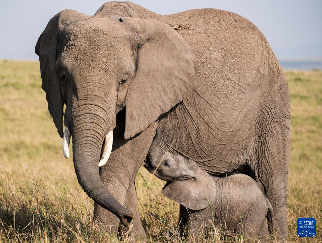 9月7日,在肯尼亚马赛马拉国家保护区,一头小象在母象腹下寻乳。