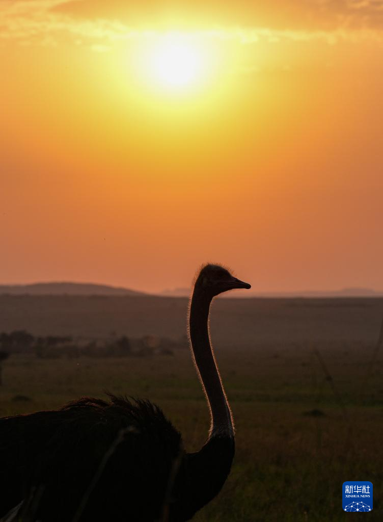 9月6日,在肯尼亚马赛马拉国家保护区,一只鸵鸟漫步在夕阳下。