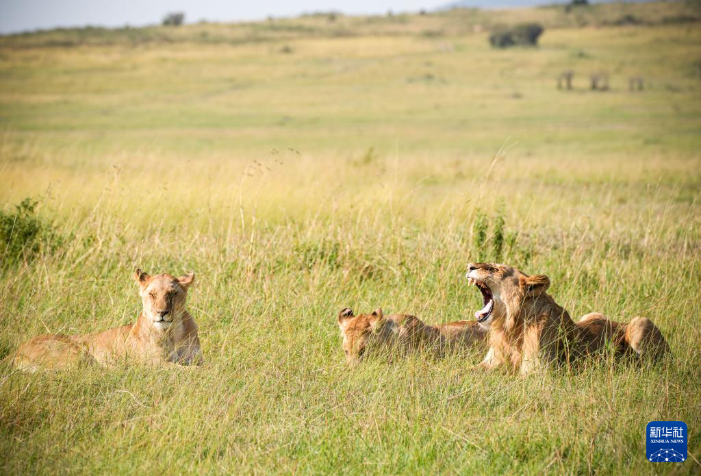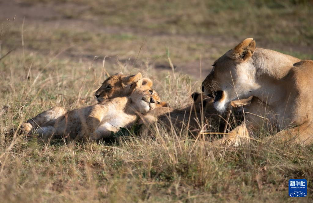 9月1日,在肯尼亚马赛马拉国家保护区,一头母狮(右)带着小狮子在草原上休息。