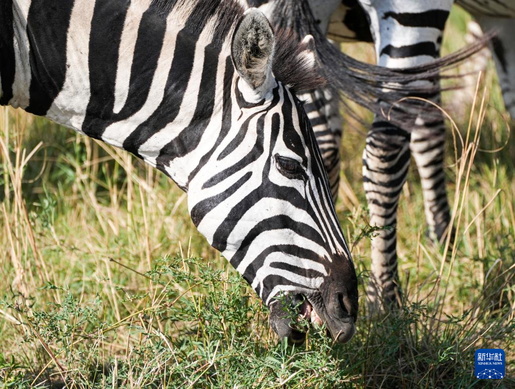 9月6日,在肯尼亚马赛马拉国家保护区,一只斑马在进食。
