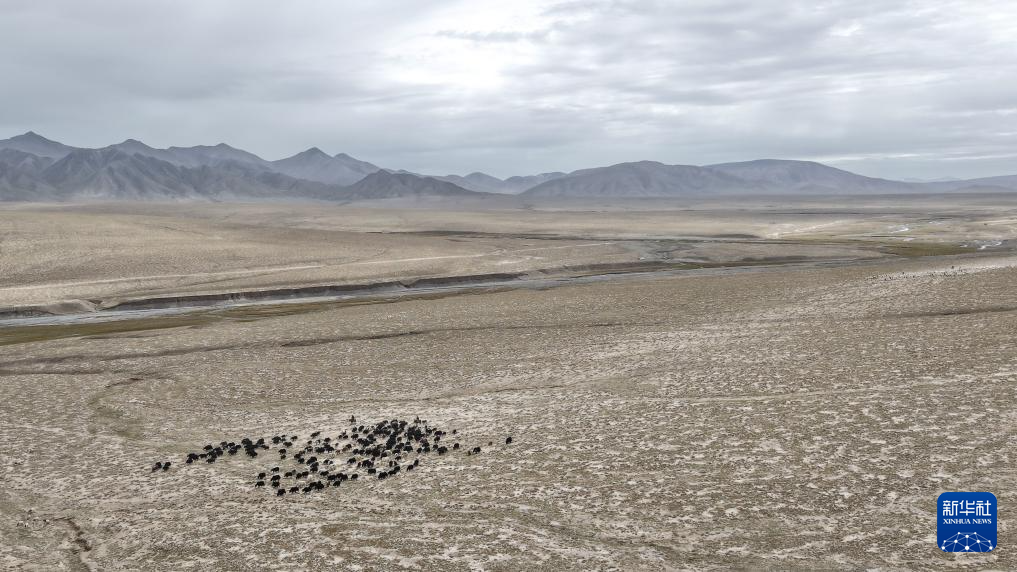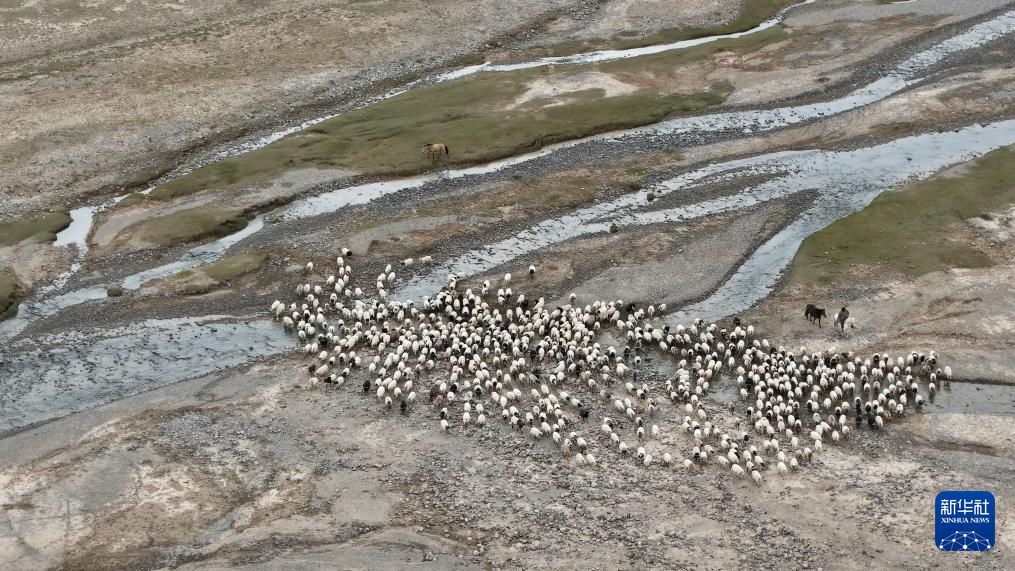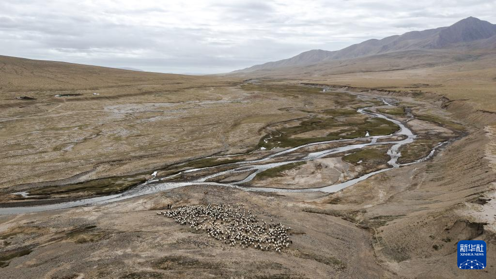 9月9日,在青海省海西蒙古族藏族自治州都兰县,牧民赶着牛羊从秋季草场出发,前往冬季草场(无人机照片)。