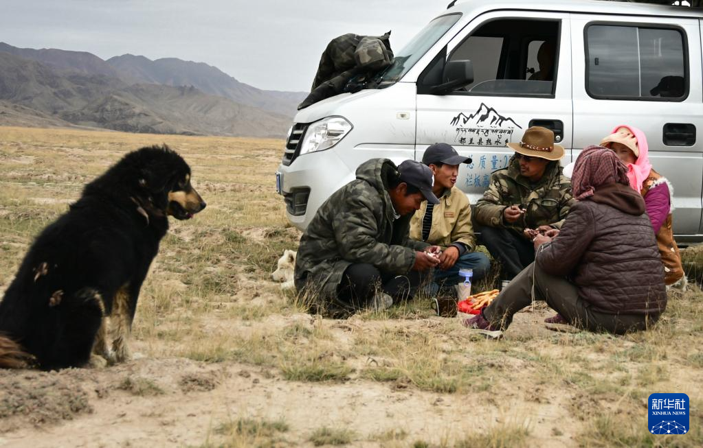 9月9日,在青海省海西蒙古族藏族自治州都兰县,牧民龙宫一家人在转场休息时吃午饭。