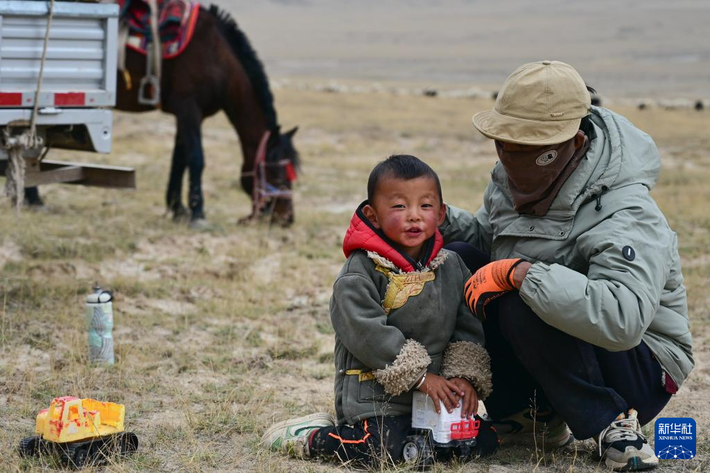9月9日,在青海省海西蒙古族藏族自治州都兰县,牧民龙宫的小孙子在转场休息时玩汽车玩具。