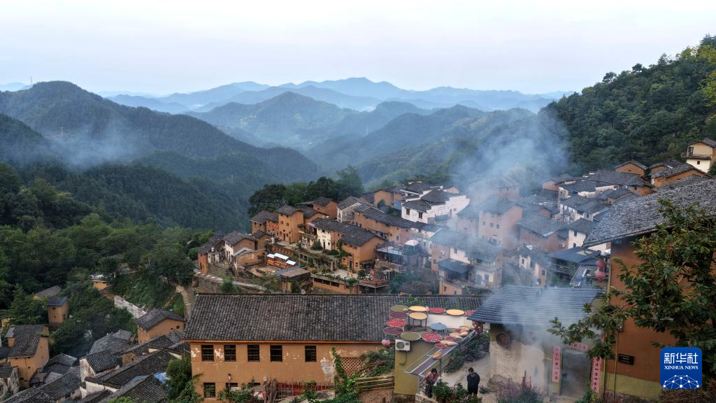 时值秋收时节,村民们利用晴好天气,将辣椒、玉米、山核桃等农作物晾晒在房前屋后,形成独具特色的“晒秋”景观。