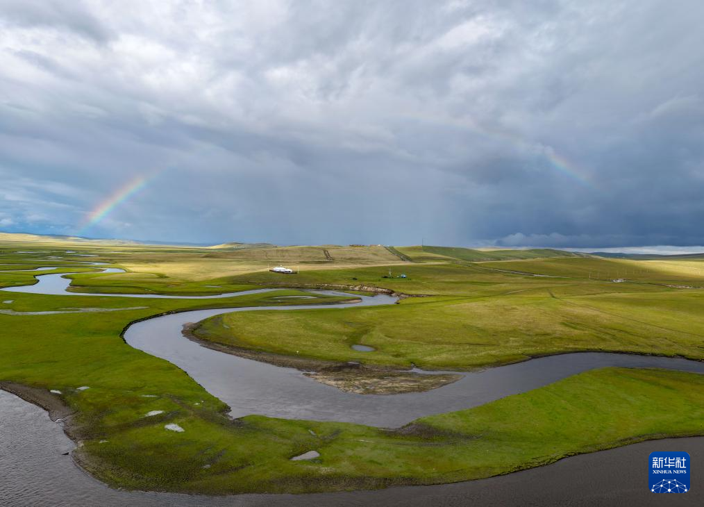 9月14日在内蒙古呼伦贝尔市陈巴尔虎旗拍摄的彩虹下的莫尔格勒河(无人机照片)。