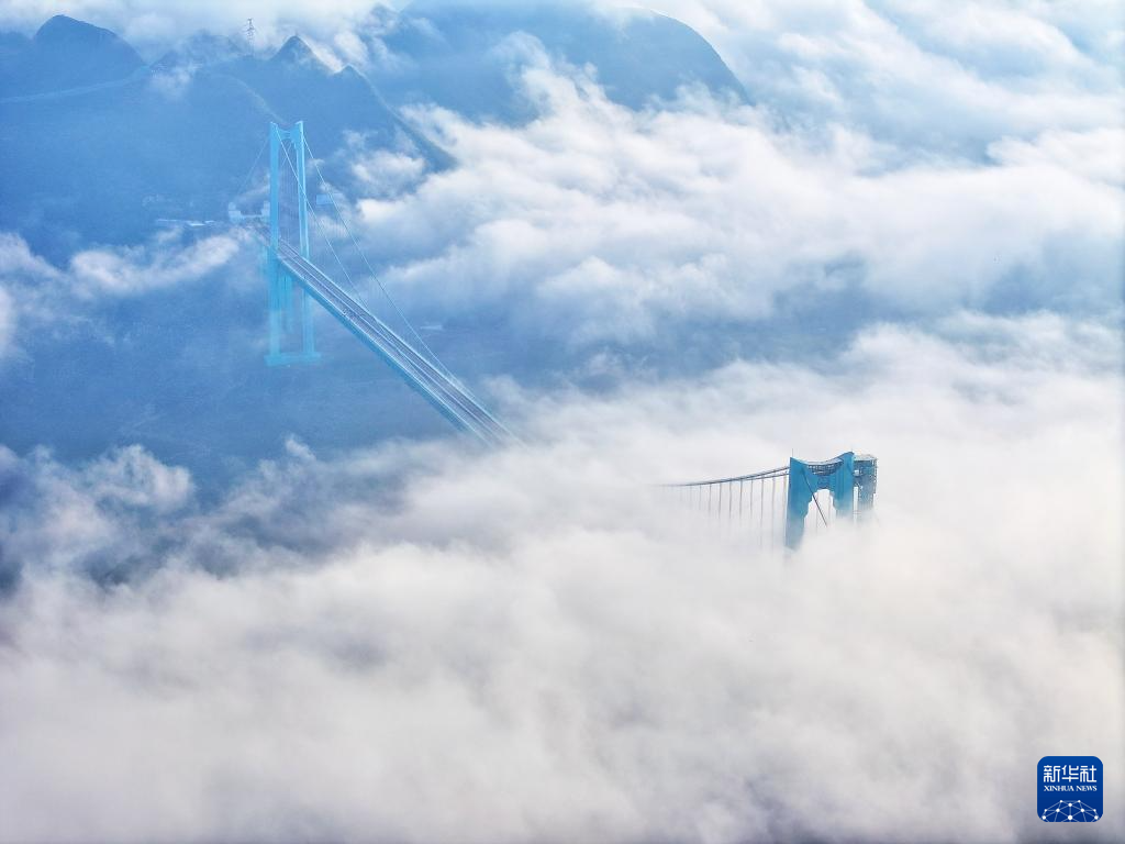 9月28日拍摄的云雾中的贵州花江峡谷大桥(无人机照片)。
