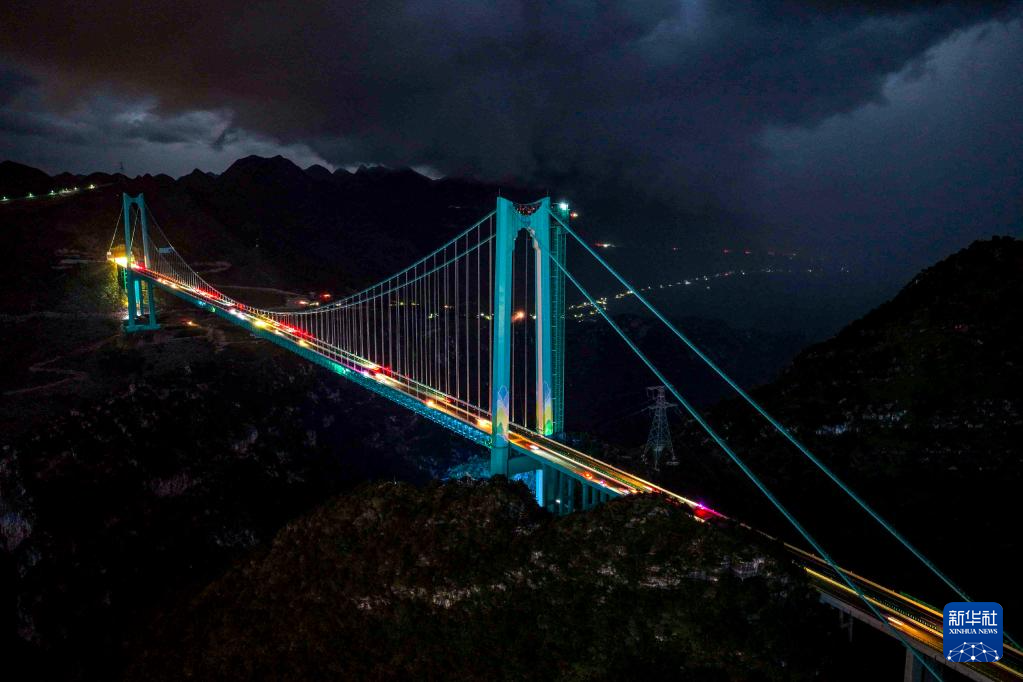 9月28日拍摄的夜幕下的贵州花江峡谷大桥(无人机照片)。
