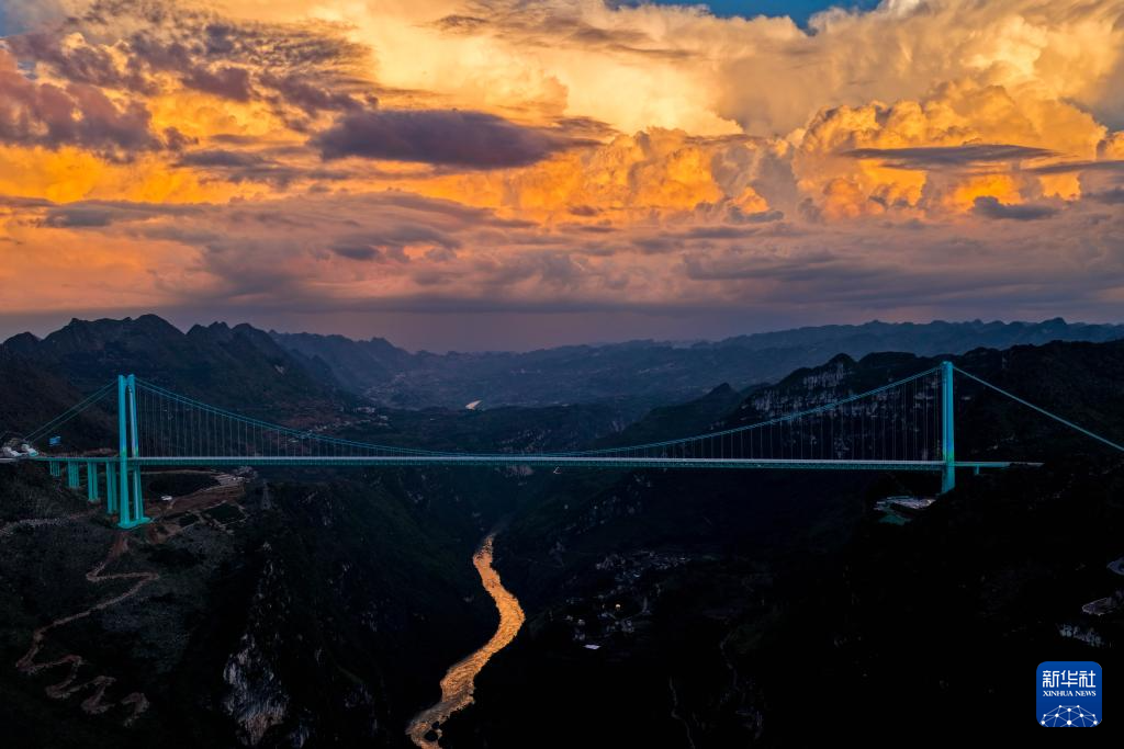 9月28日拍摄的夕阳下的贵州花江峡谷大桥(无人机照片)。