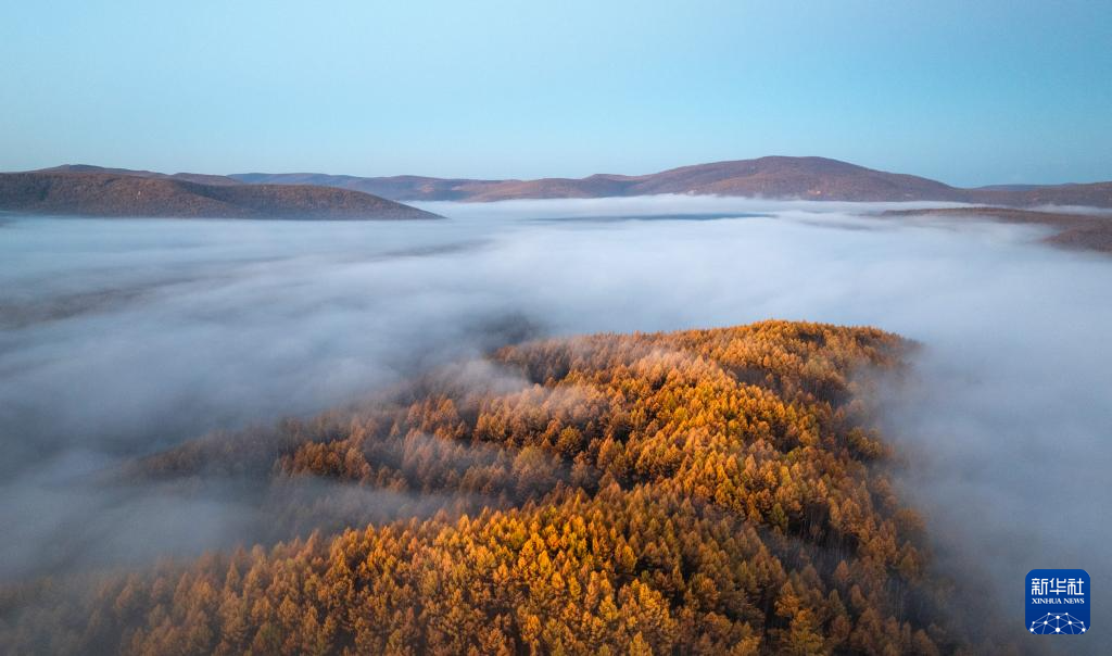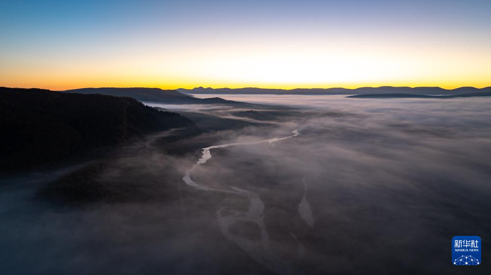9月29日拍摄的日出前的内蒙古阿尔山国家森林公园景色(无人机照片)。