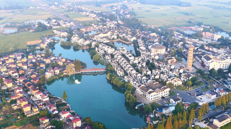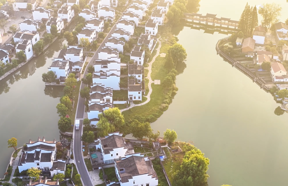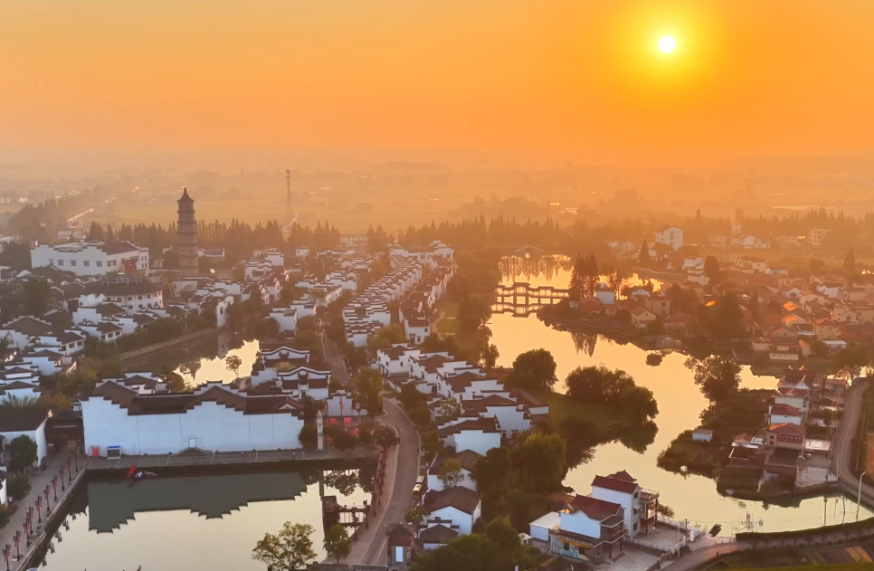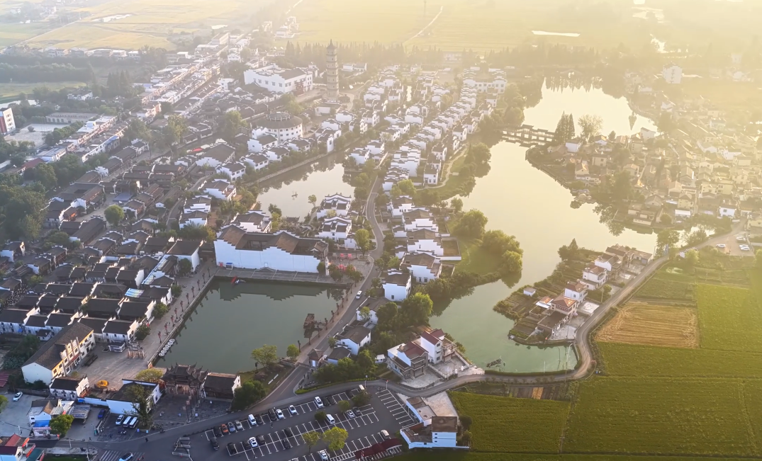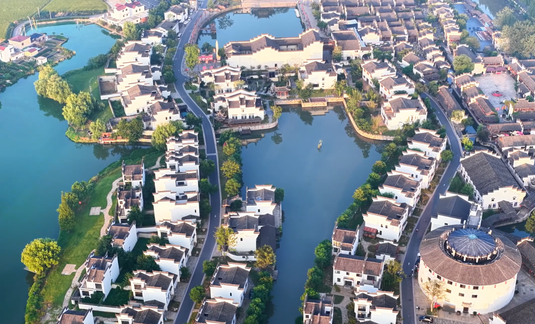 秋日清晨,位于安徽省铜陵市的犁桥水镇在晨雾中苏醒。放眼望去,白墙黛瓦的徽派民居错落有致,与湖畔倒影、街旁的金色稻田共同构成一幅和谐的江南秋景图。
