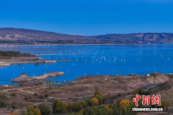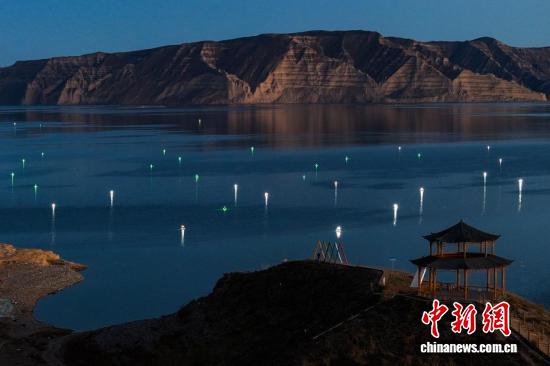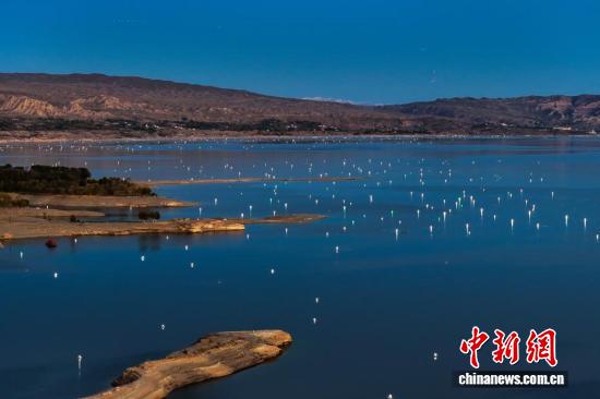 10月13日晚,位于青海省海南藏族自治州共和县的龙羊峡库区九曲里湖面,盏盏渔灯点亮湖面,与星空相映成景。龙羊峡库区水域面积383平方公里,拥有黄河上游第一座大型梯级电站——龙羊峡水电站。图为航拍九曲里湖面渔灯。中新社记者薛蒂摄(无人机照片)