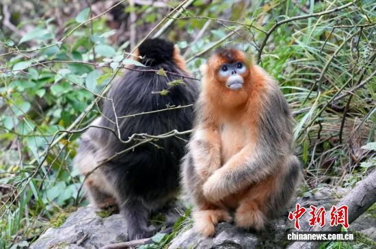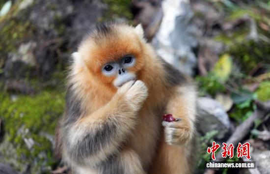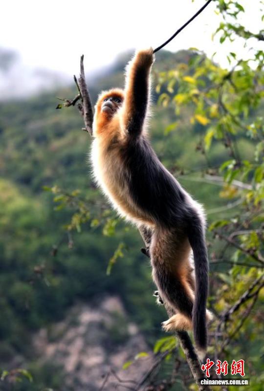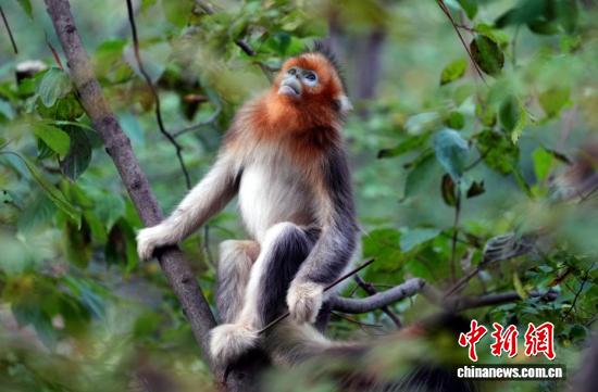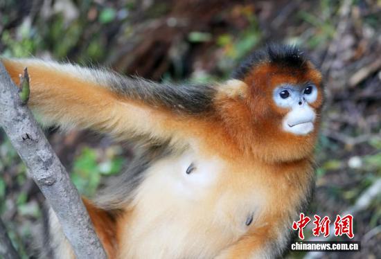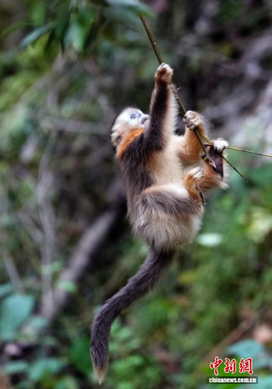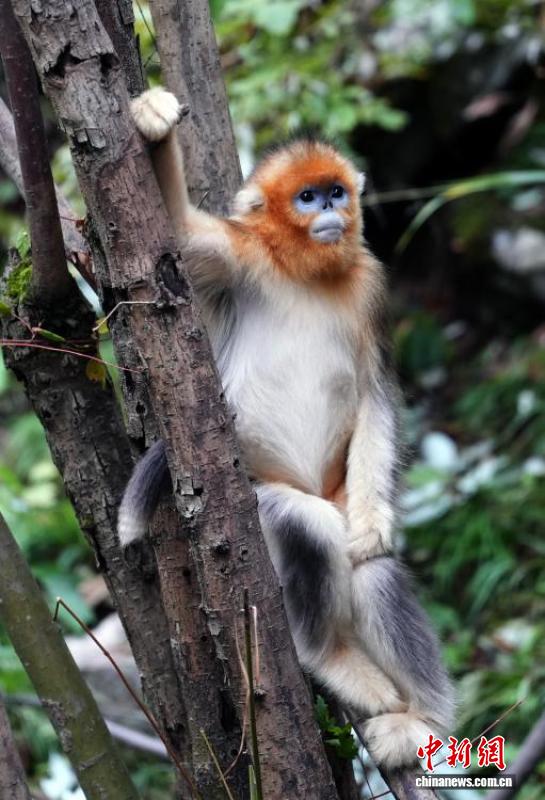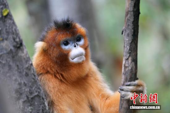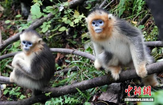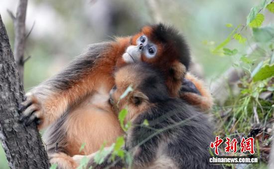 10月12日,在位于四川省阿坝藏族羌族自治州九寨沟县境内的白河金猴谷景区里,生活着约1700只野生川金丝猴,这些面颊呈淡蓝色,全身金黄、毛发油亮的川金丝猴在层峦叠翠的山林峡谷玩耍,动作轻盈、萌态十足。图为野生川金丝猴萌态十足。中新社记者 安源 摄