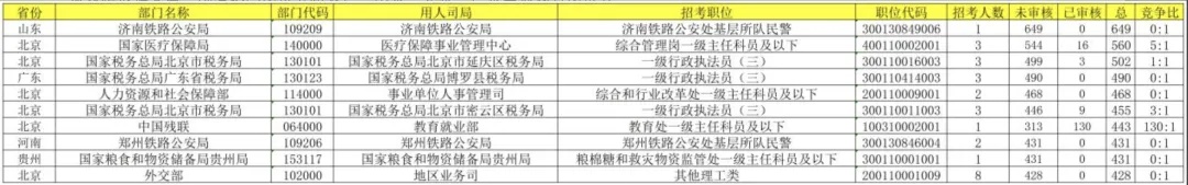 从表格数据来看,国考热门岗位分布较广,山东、北京、广东等地均有岗位入围。山东济南铁路公安局基层所队民警岗位,招考1人,未审核数达649,总报名数649,可见竞争十分激烈。