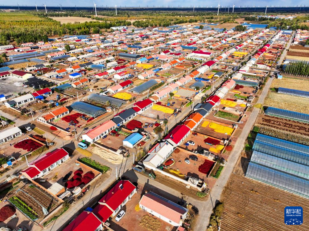 10月19日,在通辽市开鲁县东风镇六合堂村,家家户户的庭院里堆放着收获的红干椒(无人机照片)。
