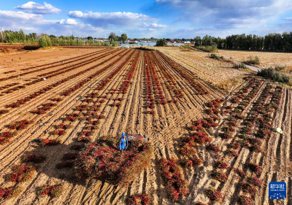 10月19日,在通辽市开鲁县东风镇六合堂村,村民在田地里收获干椒(无人机照片)。