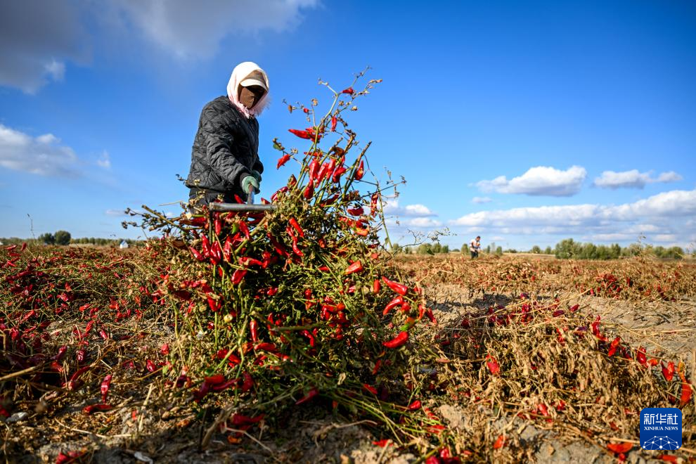 10月19日,在通辽市开鲁县东风镇六合堂村,村民在田地里晾晒红干椒。