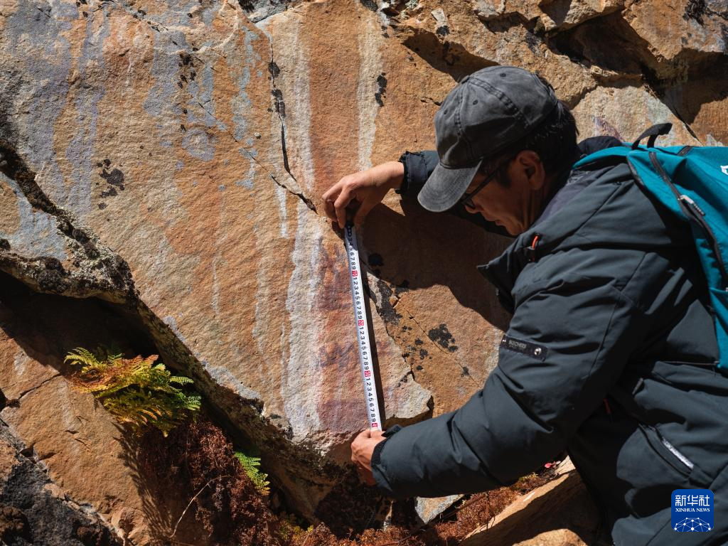 10月21日,陈雪松测量海子山老林沟拉托扎岩画信息。