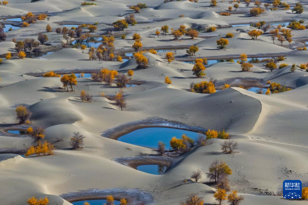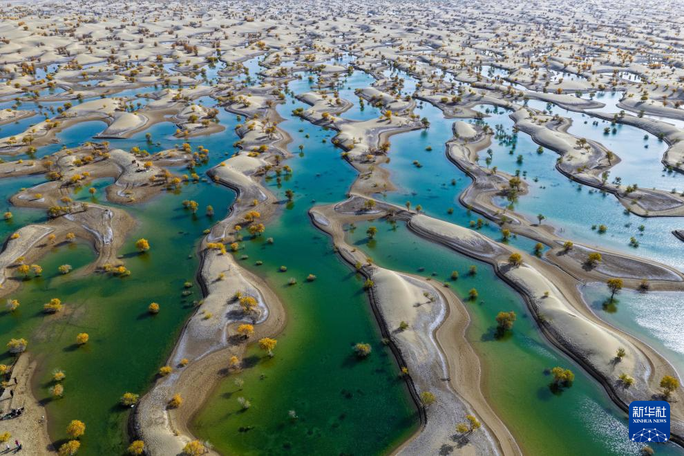 在新疆和田地区和田县翡翠湖,成片胡杨林坐落其中(无人机照片,10月20日摄)。